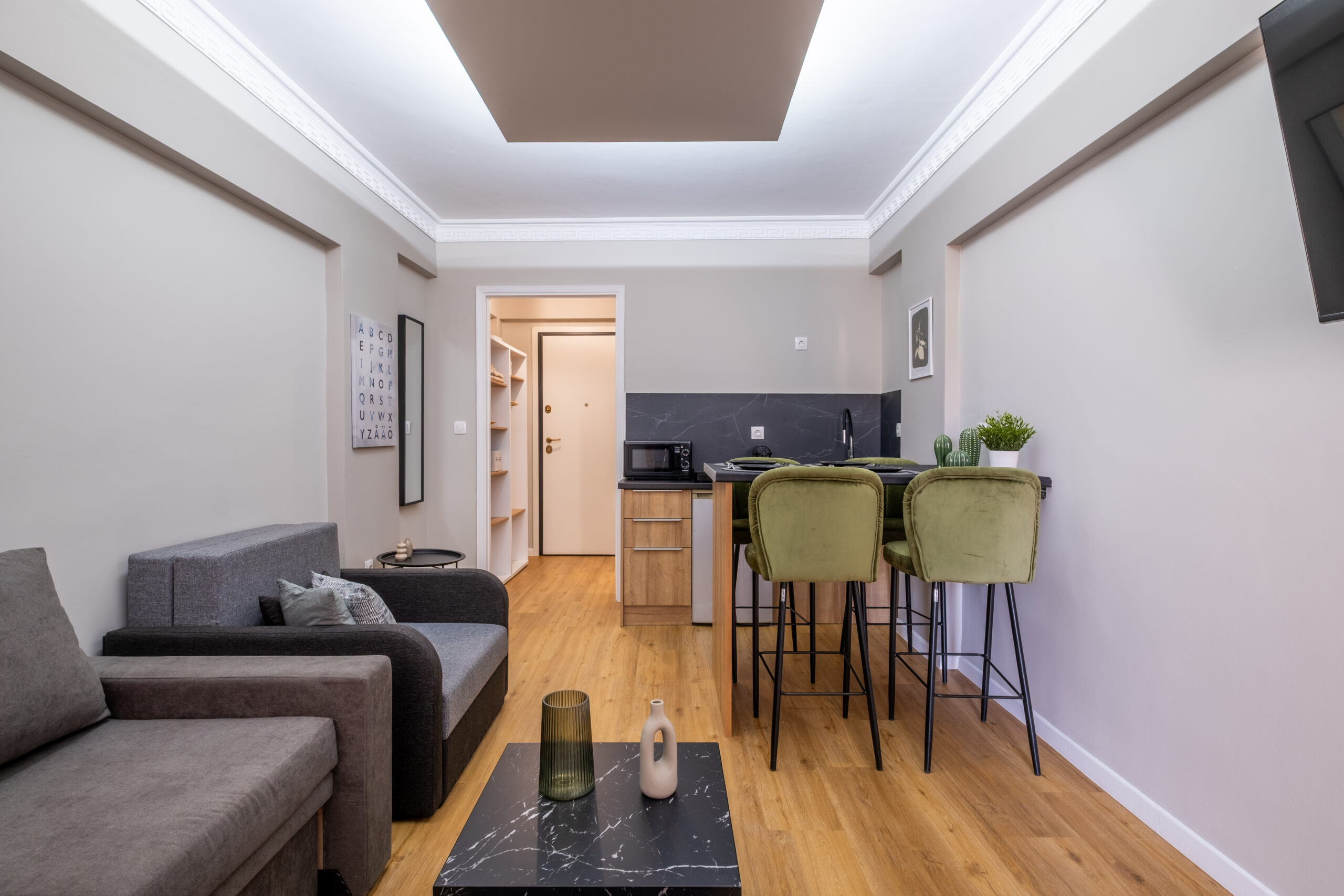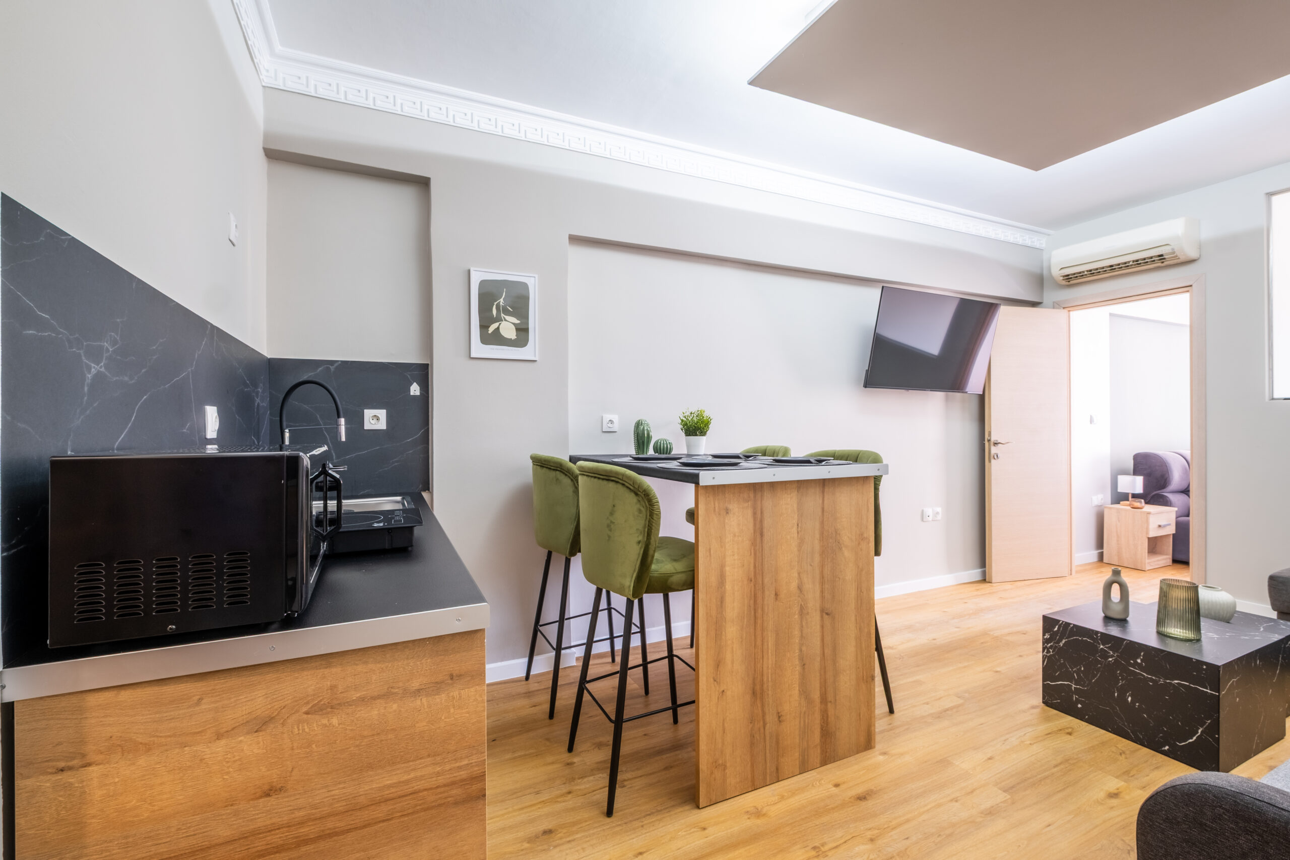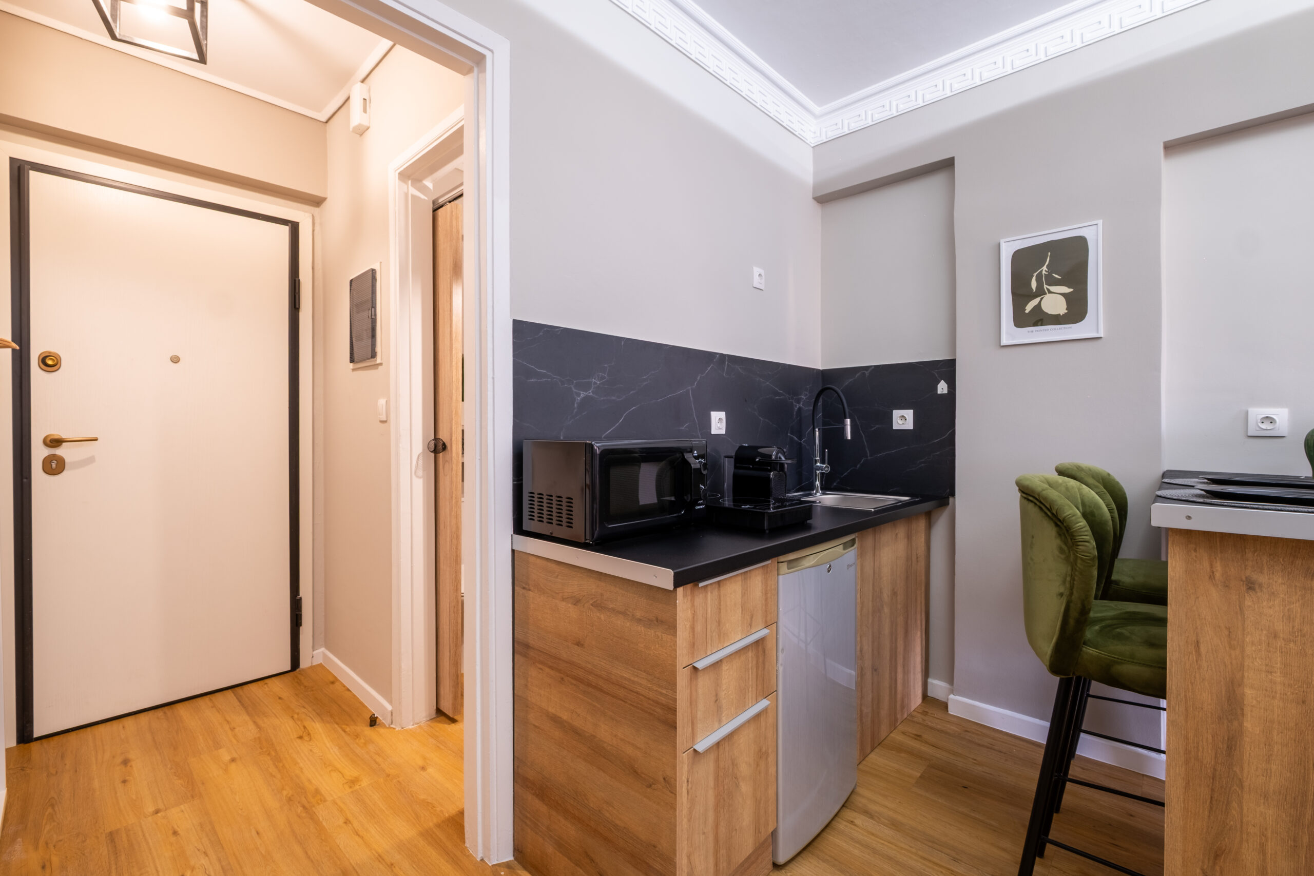 This stylish, brand new studio in the heart of Athens combines minimal design with warm, soothing green and neutral tones, which create a serene and inviting atmosphere. Cozy, comfortable and funtional, it includes high end amenities, a fully equipped kitchenette, a comfortable queen size bed and ample of storage space. Its prime location, just moments away from all the main attractions, with plenty of restaurants, cafés, bars and retail shops nearby makes it an ideal base for exploring Athens. The studio is on the second floor of an industrial building. It consists of a bathroom with a shower, an open plan space with a comfortable queen sized bed, a fully equipped kitchenette, a smart TV and ample of storage space. The windows are double glazed, the door os a safety door and bedding and linens are provided. The guests have full access and exclusive use of the entire apartment. The apartment is fully furnished and equipped and the guests can use everything that is being provided. Our fast pacing team is at your disposal. We are dedicated to offering the best possible service to our guests. You can contact us regarding any matter during your stay in Athens.