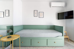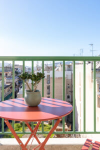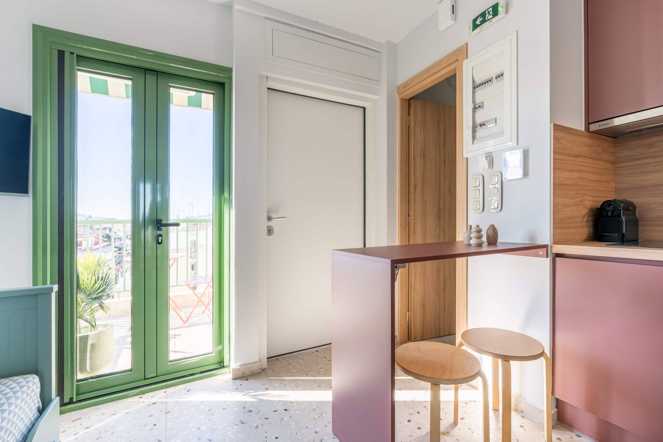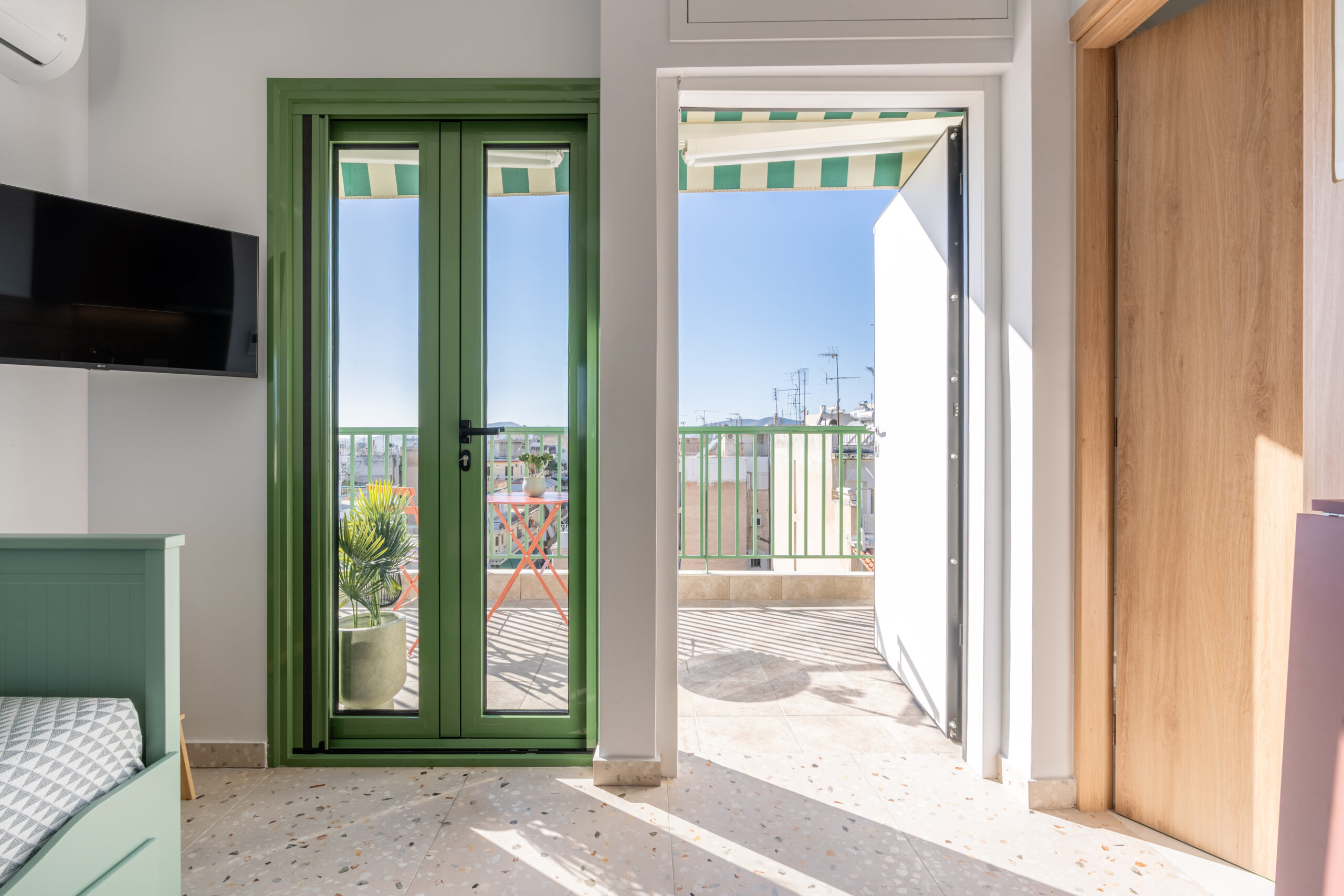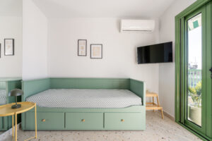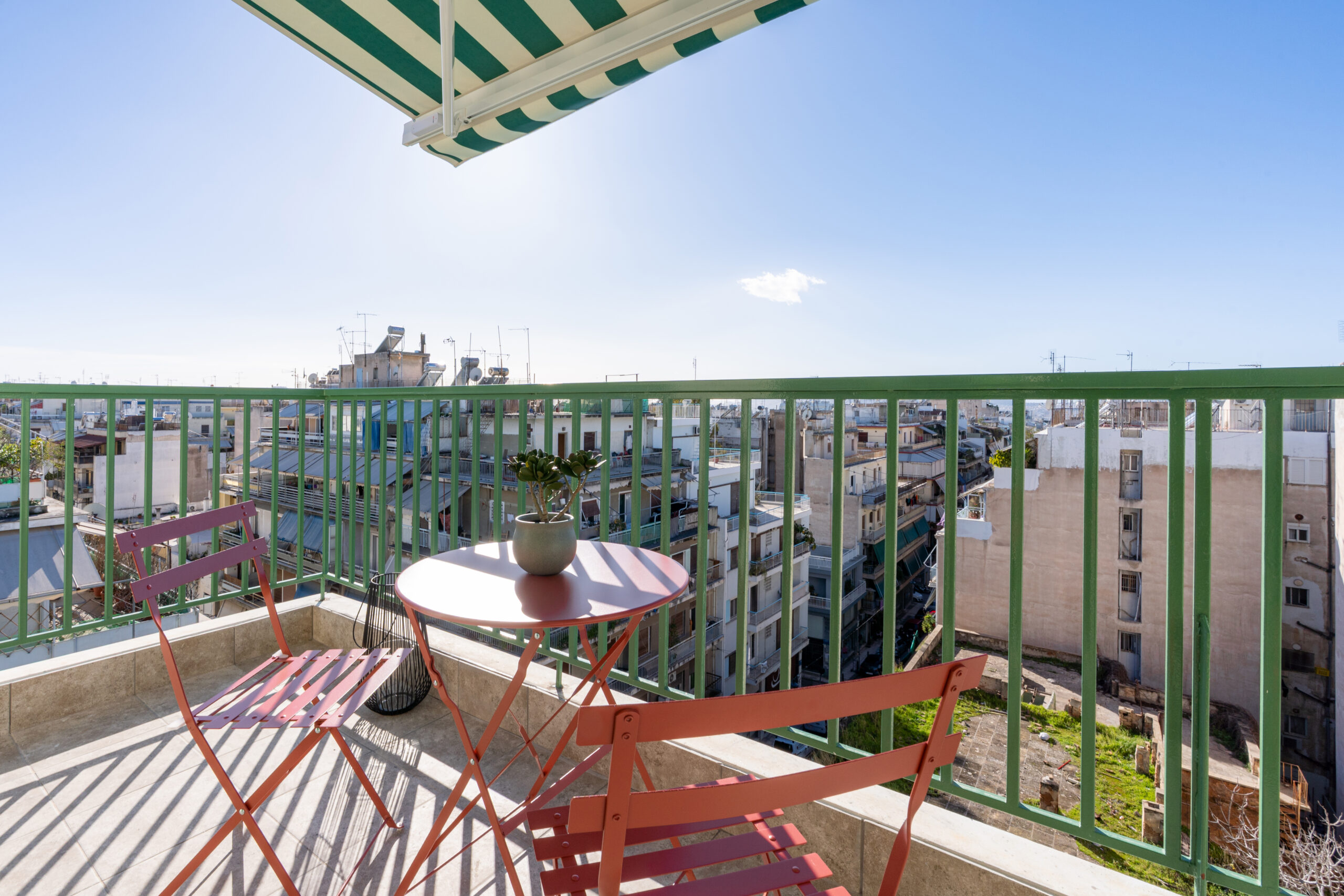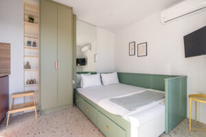 This sunny terrace studio is an exemplary application of a tiny home design. Small, yet functional and comfortable is ideal for a solo traveler who wants to feel the city vibe and appreciates calm and quiet moments as well. The sofa bed is an ideal reading nook, while the kitchen bar can double as a desk. The skyline view alone is breathtaking, but the apartment is 200 meters away from Klonaridis park, ideal for a refreshing work break. Pammakaristos hospital is also 270 meters away.