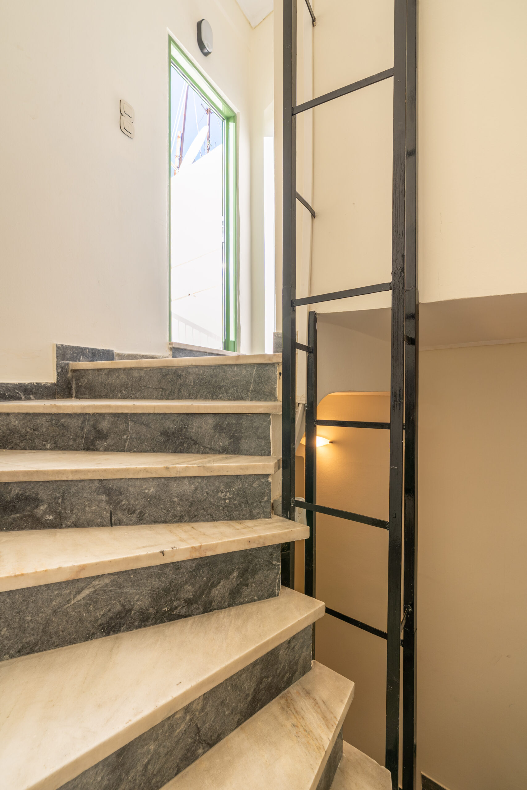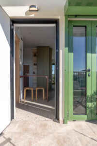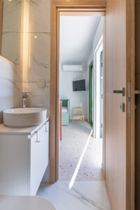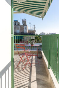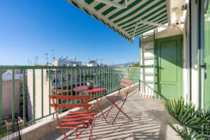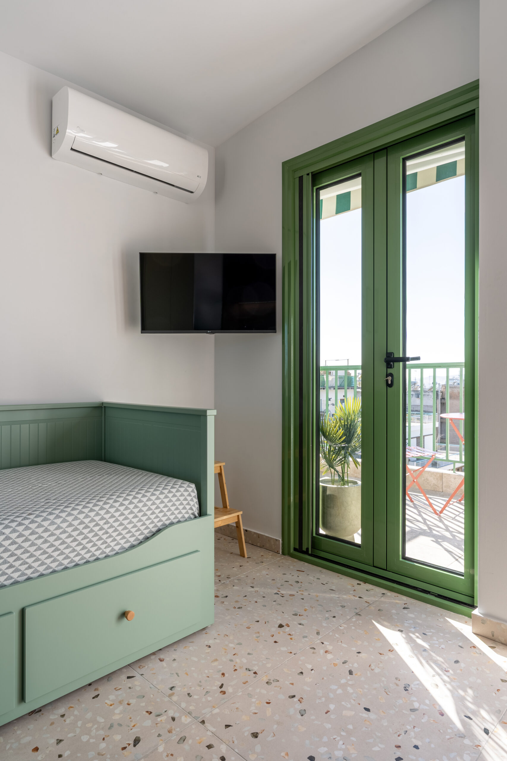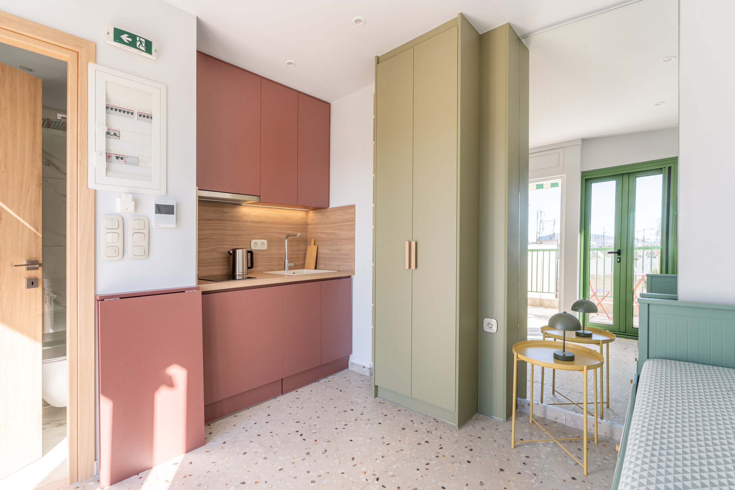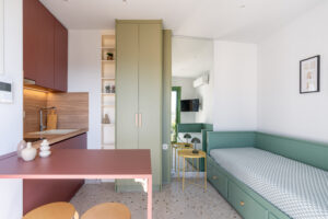 This sunny terrace studio is an exemplary application of a tiny home design. Small, yet functional and comfortable is ideal for a solo traveler who wants to feel the city vibe and appreciates calm and quiet moments as well. The sofa bed is an ideal reading nook, while the kitchen bar can double as a desk. The skyline view alone is breathtaking, but the apartment is 200 meters away from Klonaridis park, ideal for a refreshing work break. Pammakaristos hospital is also 270 meters away.